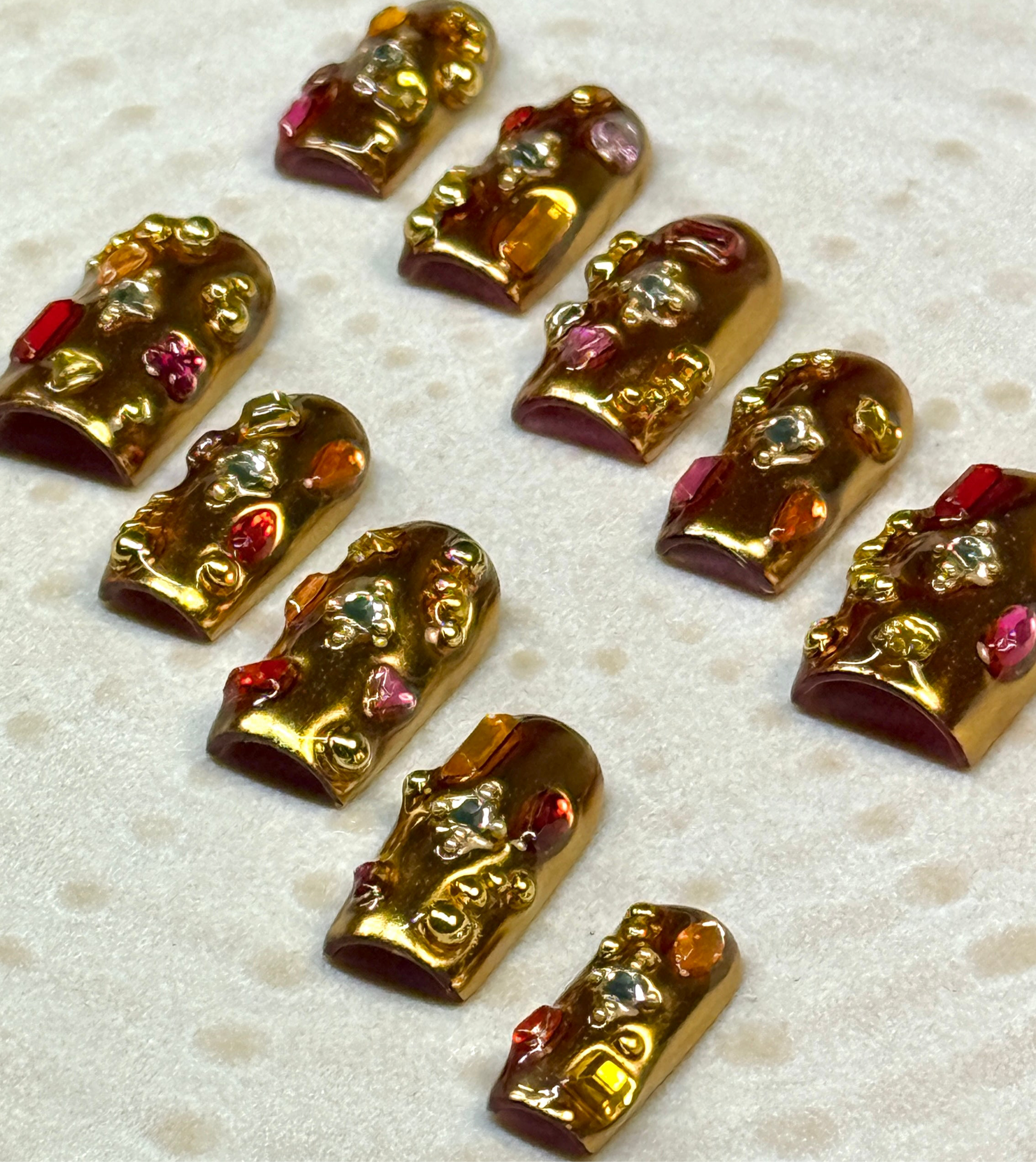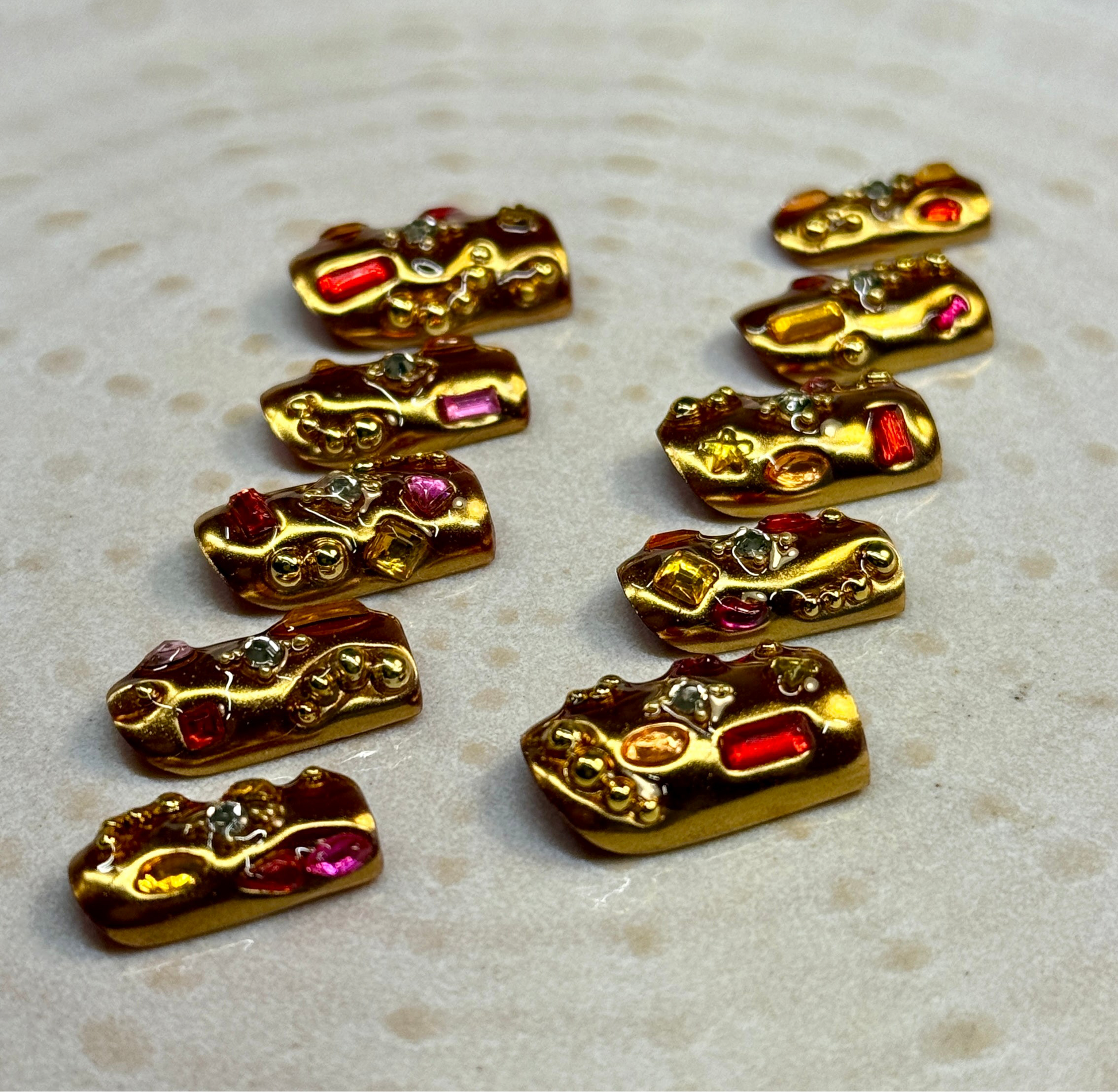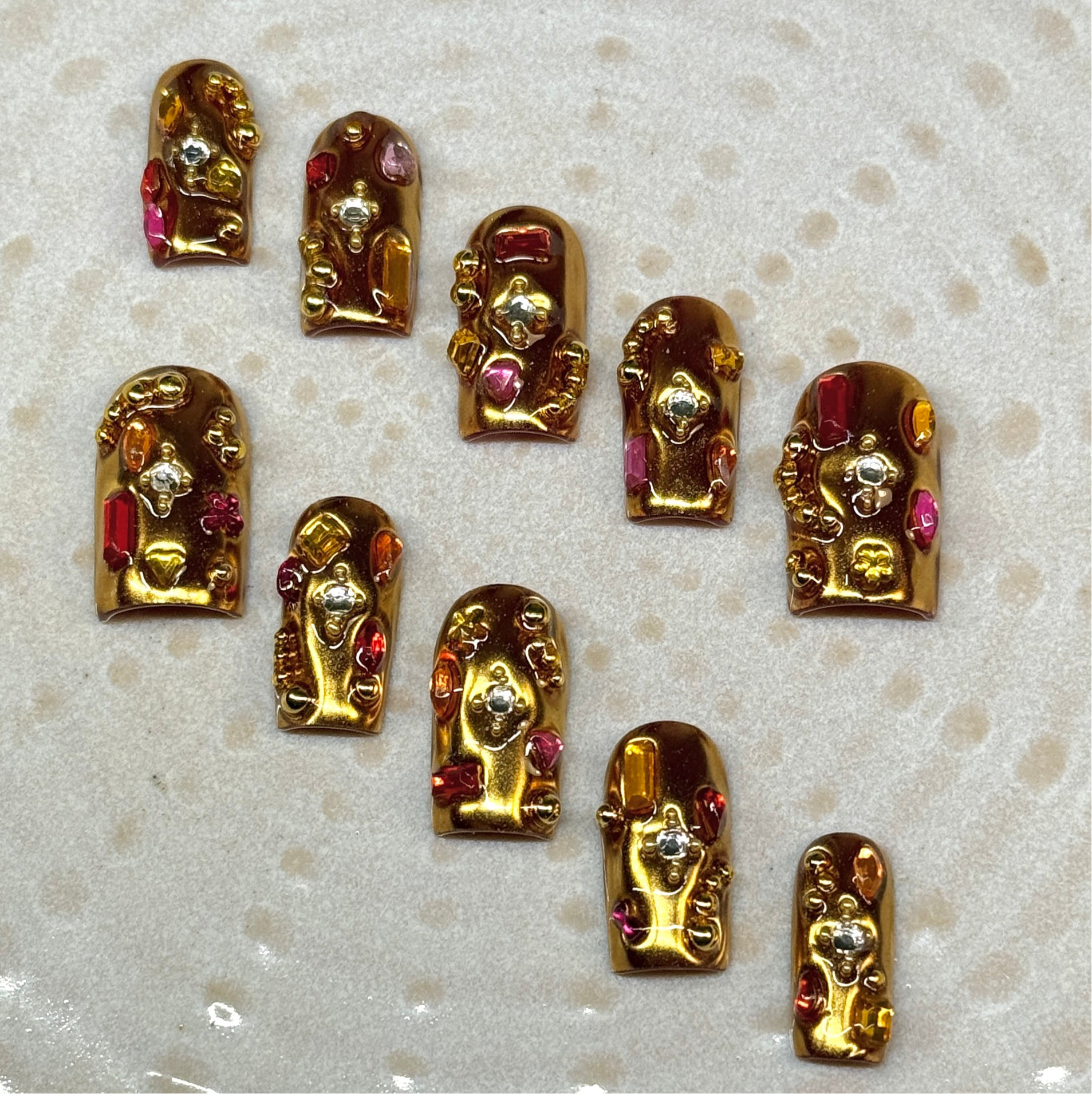 Full Gold Chrome nail base with pink, red, orange, and yellow gems securely embedded on top with added gold studs for extra golden glow.
