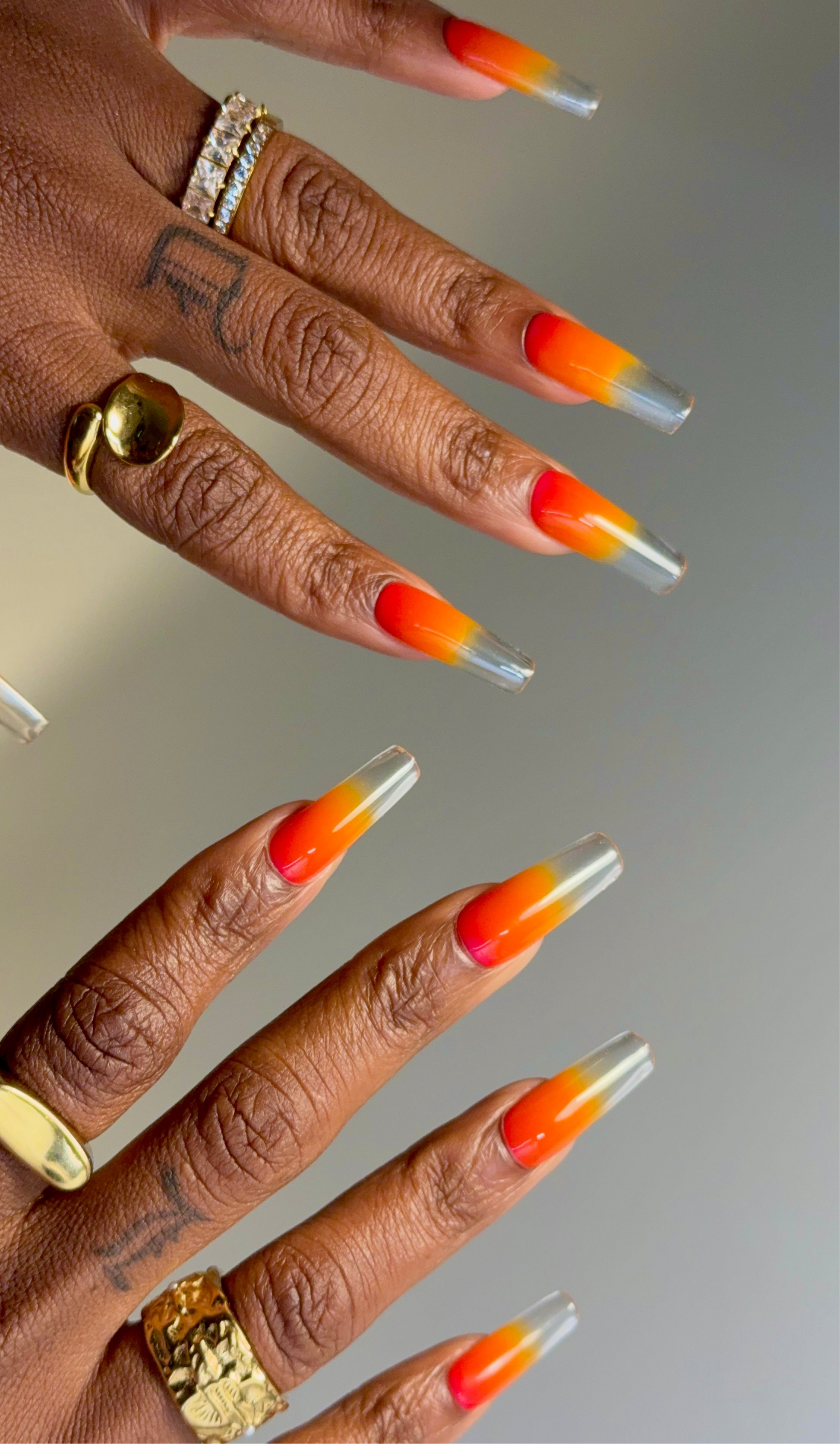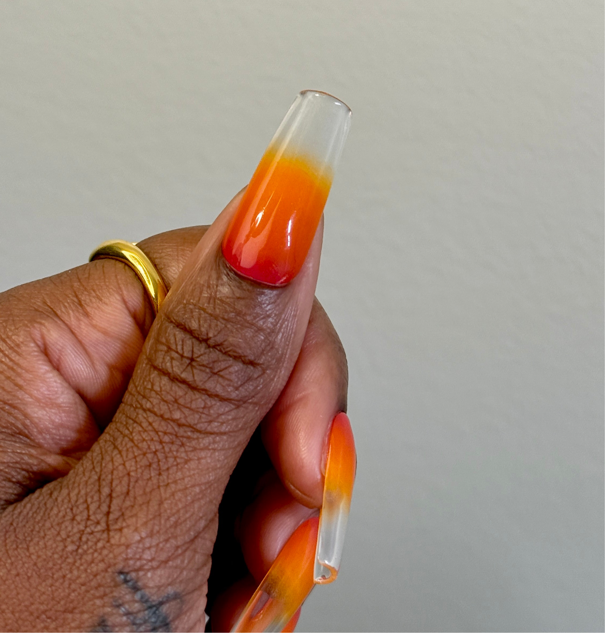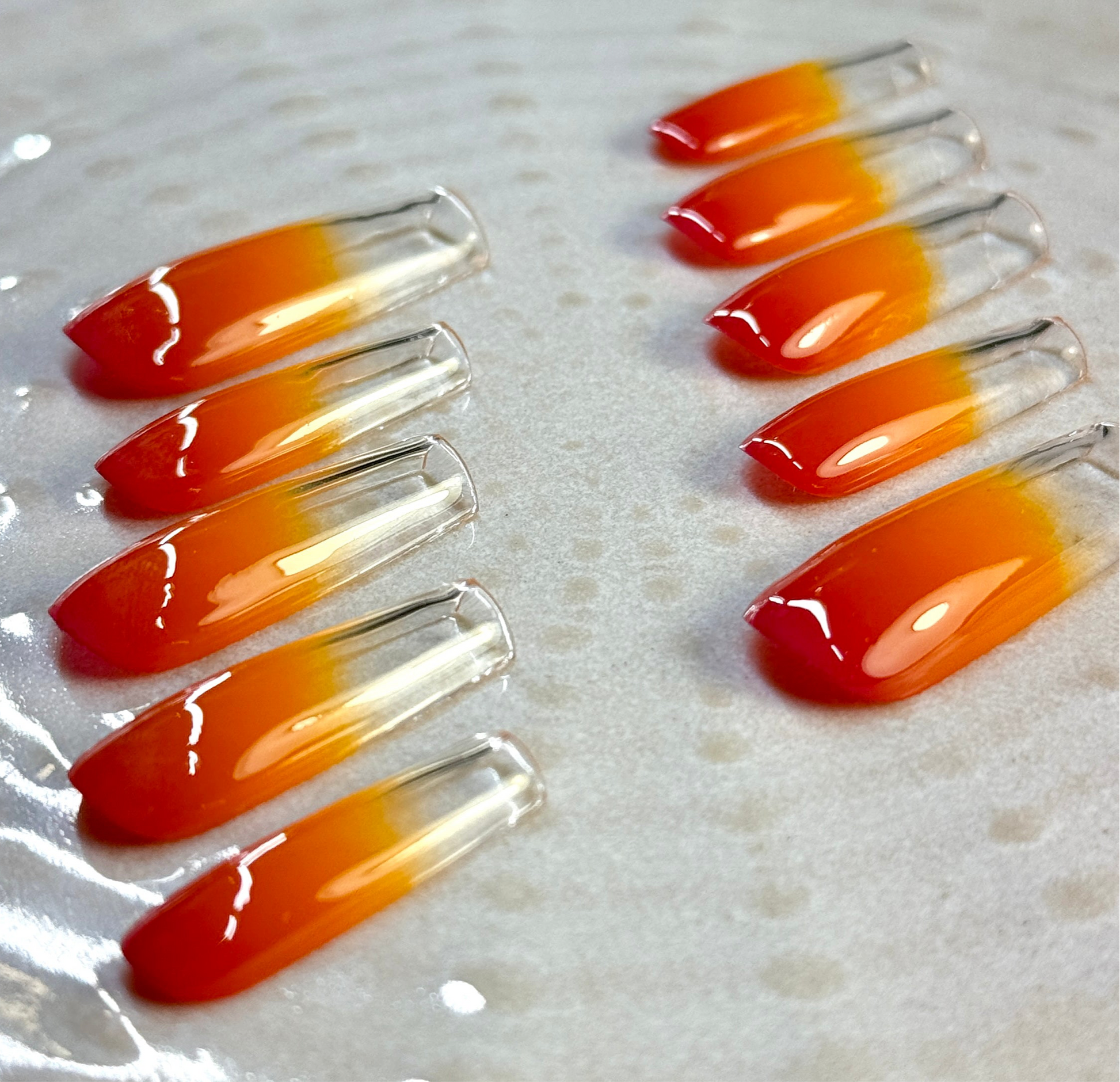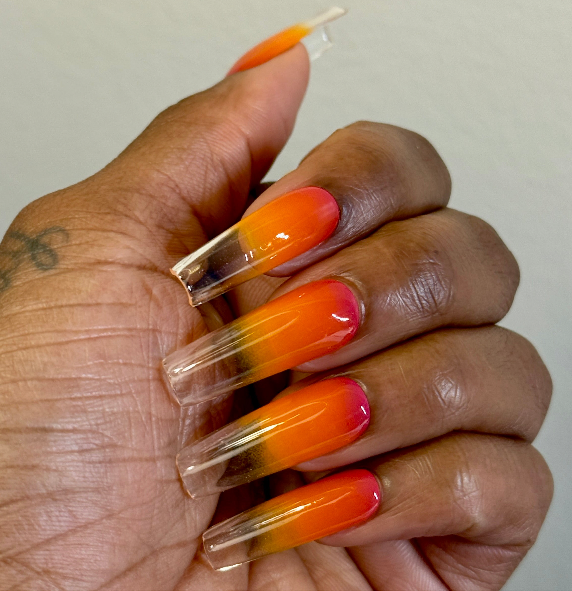 ...with an ombre fuchsia to golden yellow base. A longer nail choice will result in more of a glass effect tip. Both the top and under side of each nail is seal with a top coat to resist nail stains from effecting the glass effect.