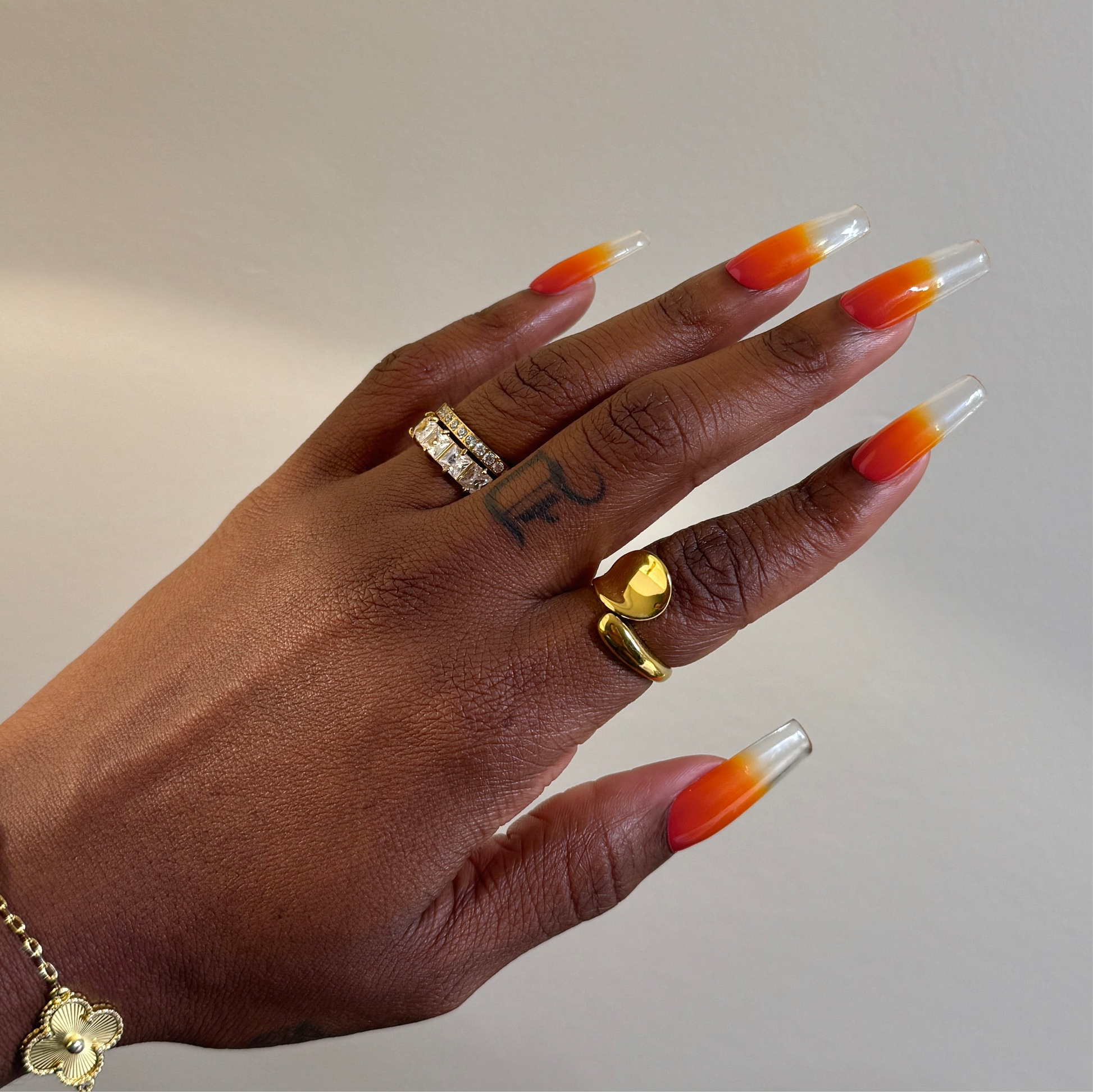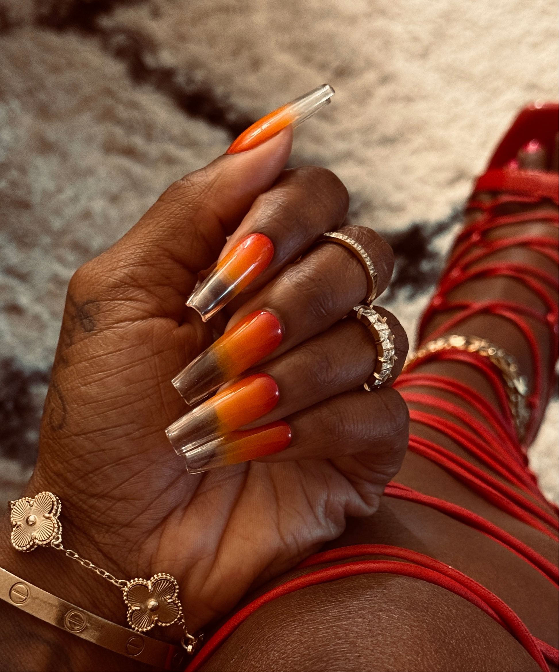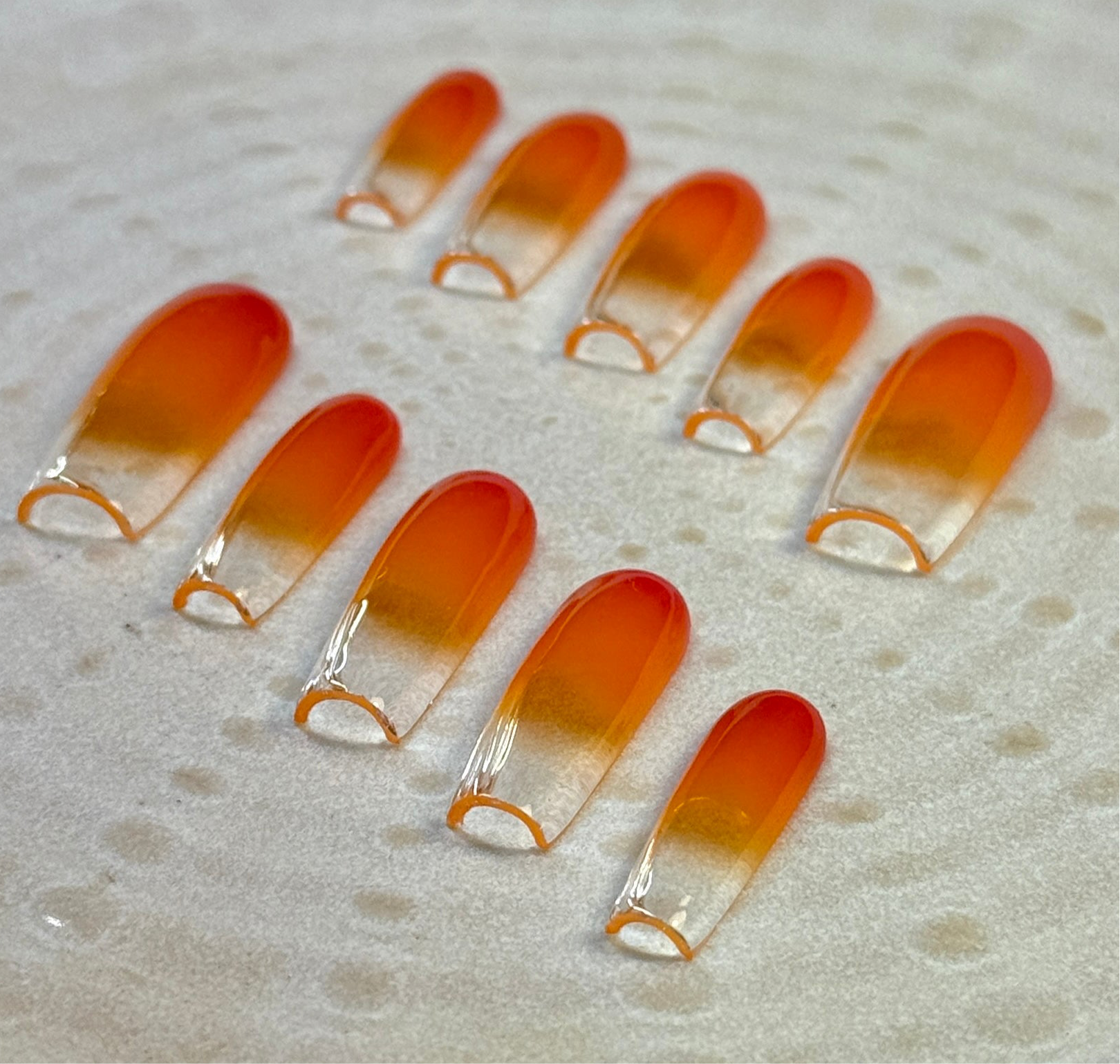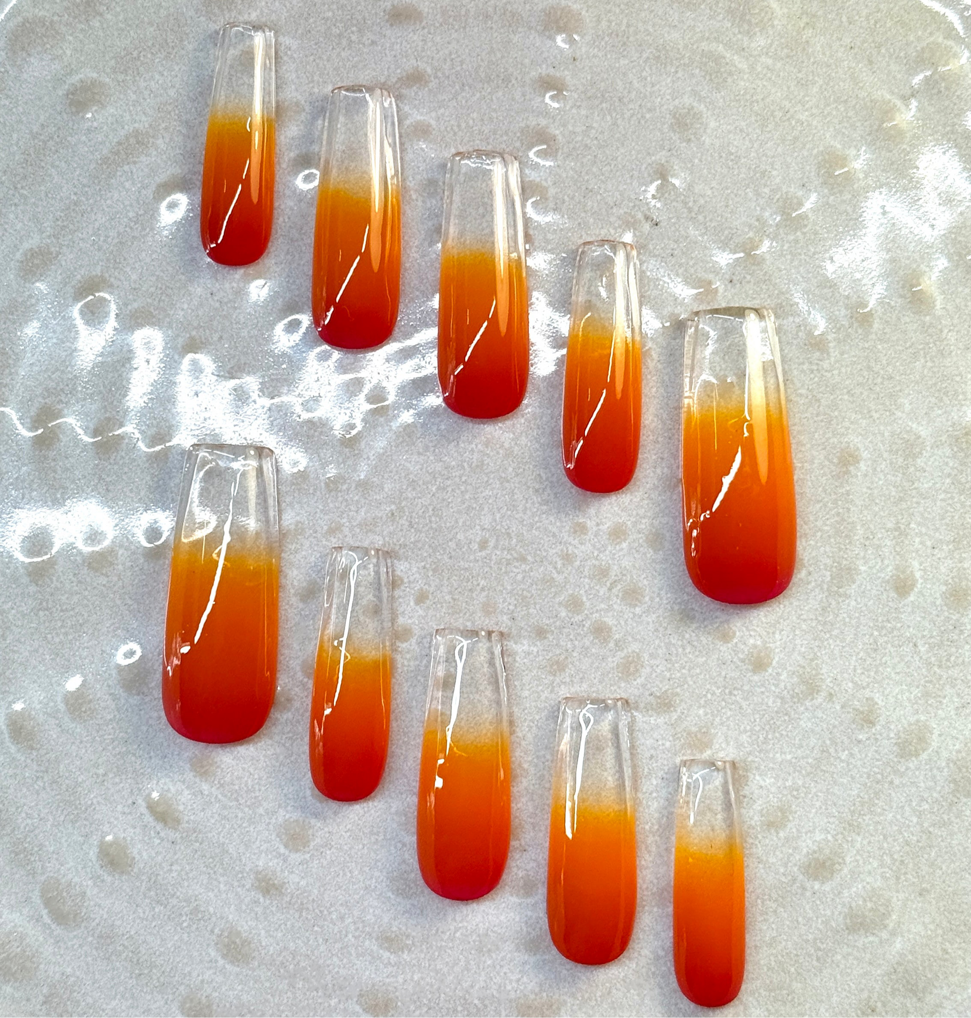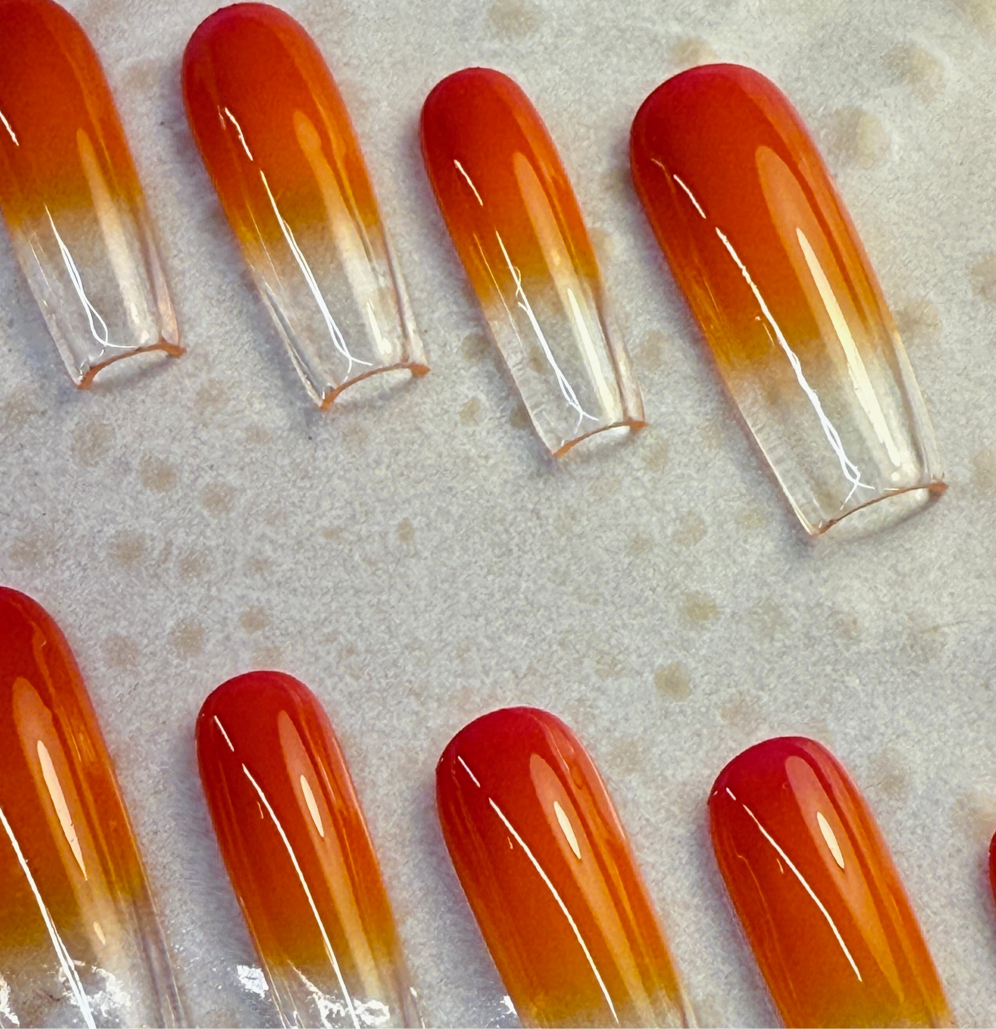 ...with an ombre fuchsia to golden yellow base. A longer nail choice will result in more of a glass effect tip. Both the top and under side of each nail is seal with a top coat to resist nail stains from effecting the glass effect.